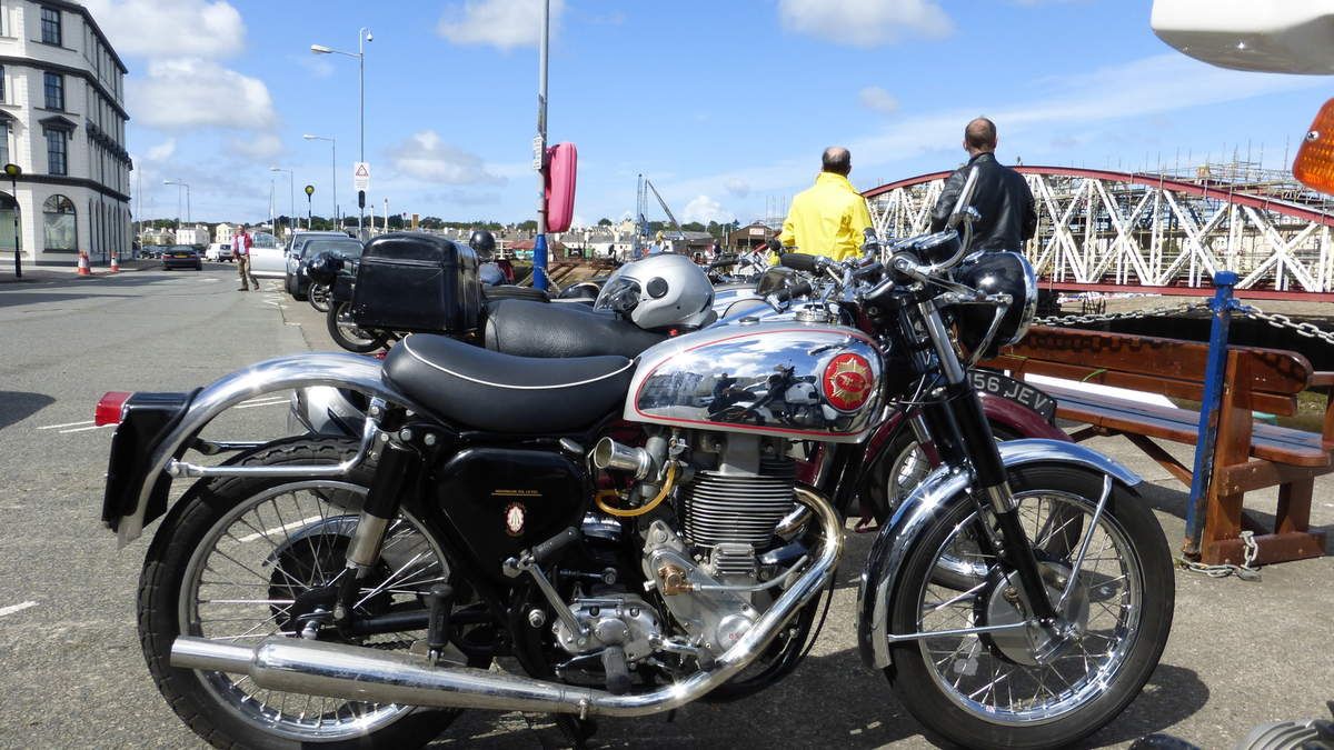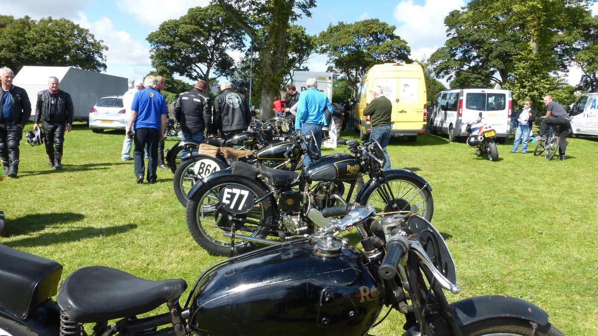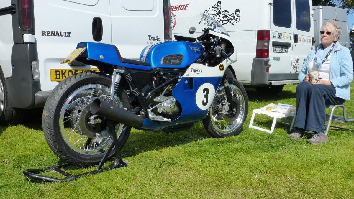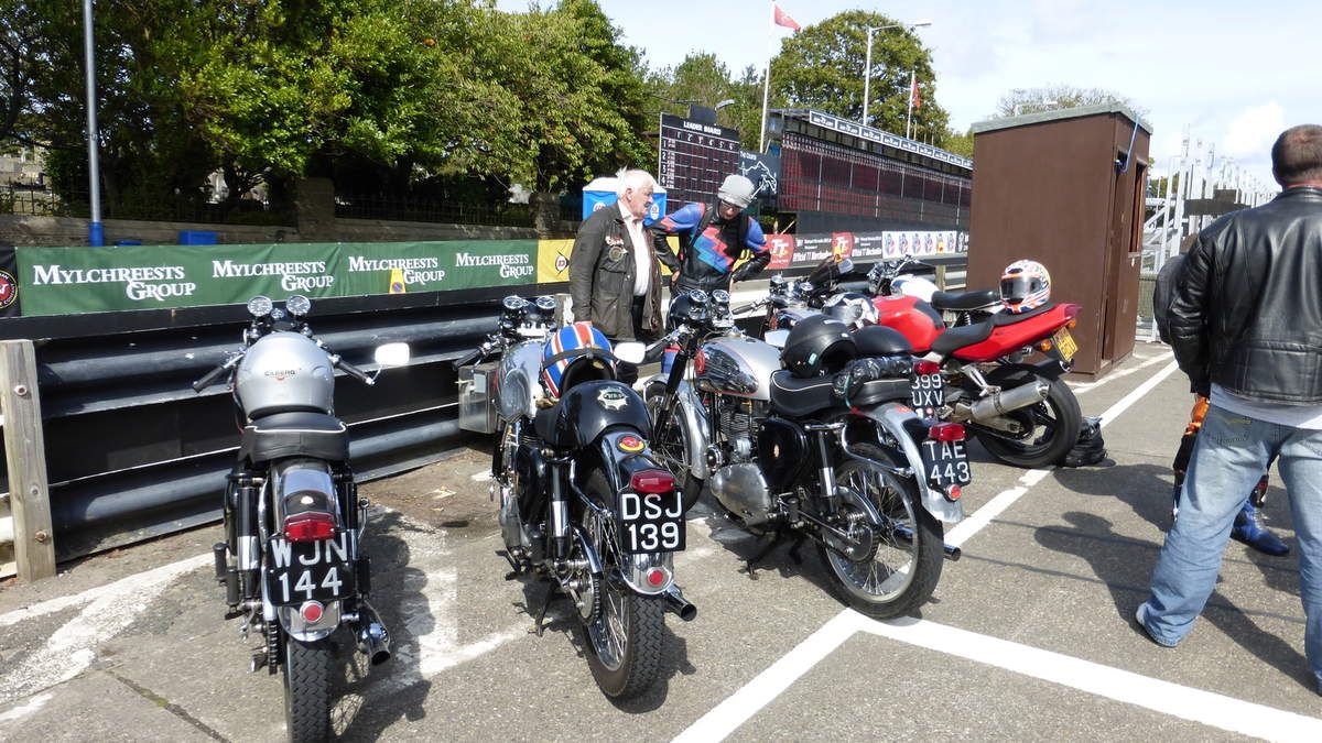 Au camping, nous sympathisons avec un anglais installé à côté de nous. Il a amené 3 motos : une Ariel 250 deux temps, une Triumph coursifiée de 1968 et un Norton Manks. Il nous raconte que son père a fait le TT en 1952 sur la Norton. Ces motos feront partie de la parade qui fait le tour du circuit devant des milliers de spectateurs. Nous faisons aussi connaissance avec des bretons, un couple en side BM et leurs enfants et un solitaire en Guzzi que nous avions déjà croisés au musée de Birmingham. Bonjour à vous 5. Nous rencontrons également 2 bordelais avec leurs superbes 1000 Vincent et leur amie avec un Royal Enfield.